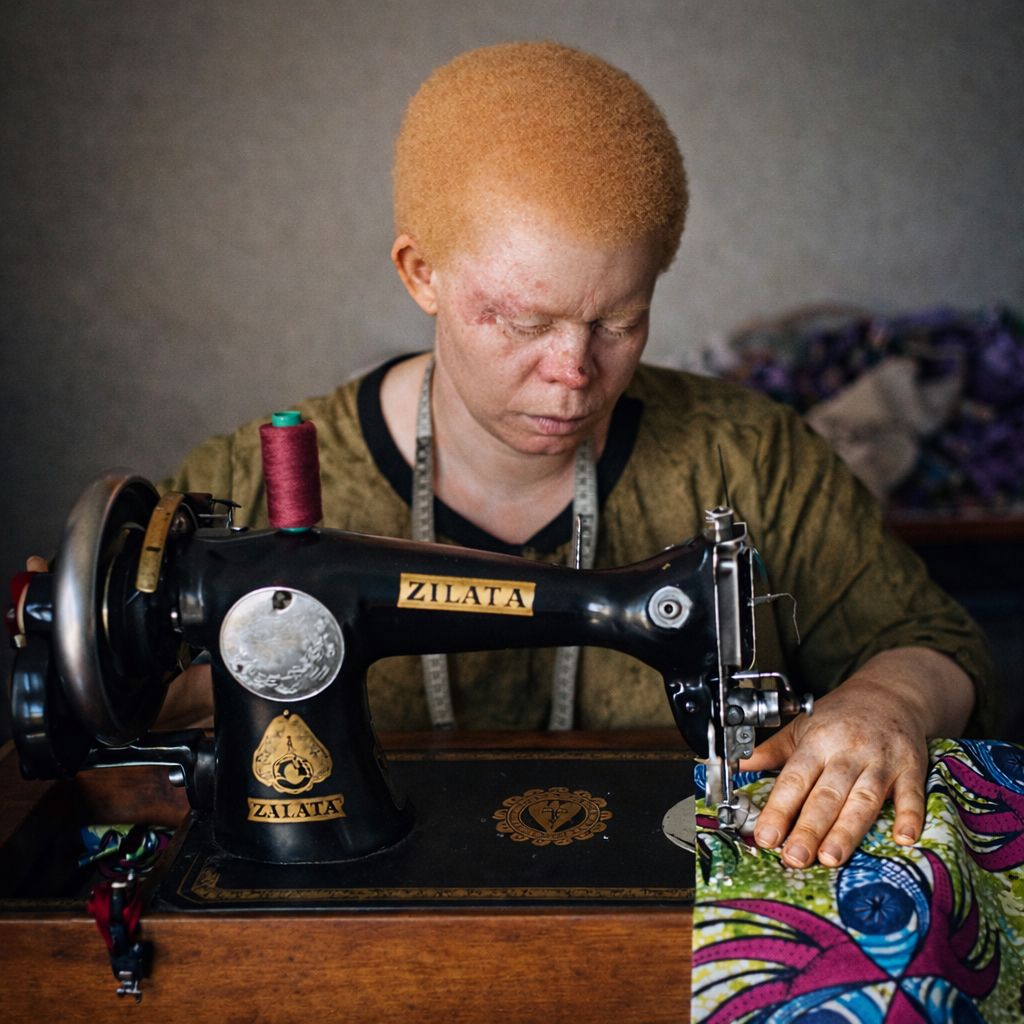 Today she runs a tailoring business and serves as a leader in the Moseka Albino community, advocating for dignity and inclusion.